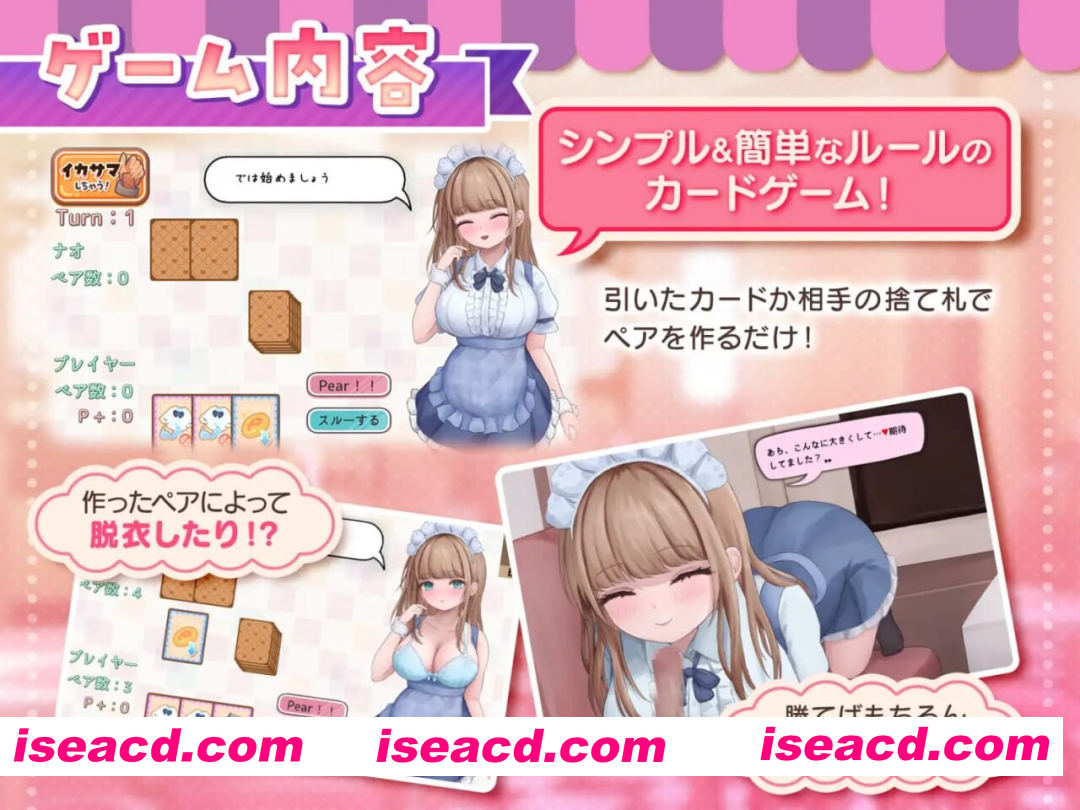 剧情概要 主人公(你) 为了见到看板娘「奈绪酱」而频繁光顾一家女仆咖啡厅。 已经成为常客的你,收到了奈绪酱的邀请。 “如果能赢过我,就可以做H的事情…… ……这样的游戏,要试试吗?” 面对这求之不得的邀请, 你立刻点头答应。 ……殊不知,那里正暗藏着陷阱。 游戏内容 规则简单的卡牌游戏 当然包含脱衣元素!! 还有必备的作弊功能!! 巧妙运用作弊手段让游戏更有利!! 游玩卡牌游戏可获得点数 使用点数可以解锁各种装扮变更选项!! 丰富的事件插画与差分 女主角 更新记录 ver1.02 ・硬币持有上限提升,1500点数达到上限 ver1.01 ・修复无法触发第二次肛交行为的问题 ・新增规则确认按钮 ・修正全裸奖励判定错误的问题 ・作弊使用时增加取消按钮 ・修正错别字