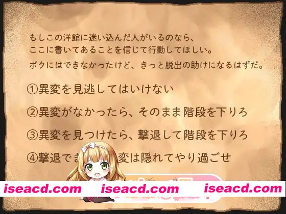 8层洋房 正式版 (8階洋館) 情节梗概: 为了寻找失踪的朋友,我根据从他那里听到的最后一个关于“洋馆的传闻”,离开了家。 我一直在没有道路的森林里拼命奔跑,仿佛它在等待我一般,森林深处出现了一座洋馆。 我的意识突然变得模糊,回过神来时,已身处一栋陌生的建筑物中。 看来我似乎是在那座洋馆里面。 基本规则1 穿过走廊,走下楼梯,逃离这座神秘的洋馆! 走廊里可能会出现异变。 遇到这种情况时,要巧妙地应对,比如躲藏在隐蔽物后避开,或者使用十字架进行攻击,然后继续前进。 基本规则2 洋馆的楼层结构是:没有异变的∞层(无限层),以及会随机出现异变的1至8层。每成功通过一层,就会下降到下一层。 : :fasvzx 会员:FM666WF8BHNVSVIP 开通会员输入可以省很多钱! 资源下载下载价格VIP专享仅限VIP下载升级VIP立即购买 常见问题 解压密码错误?点击查看》PS:如果提示密码错误,推荐使用Bandizip解压或修改后缀为zip 有些人是因为解压密码复制错误,请手动扩选解压密码,不要直接点复制。