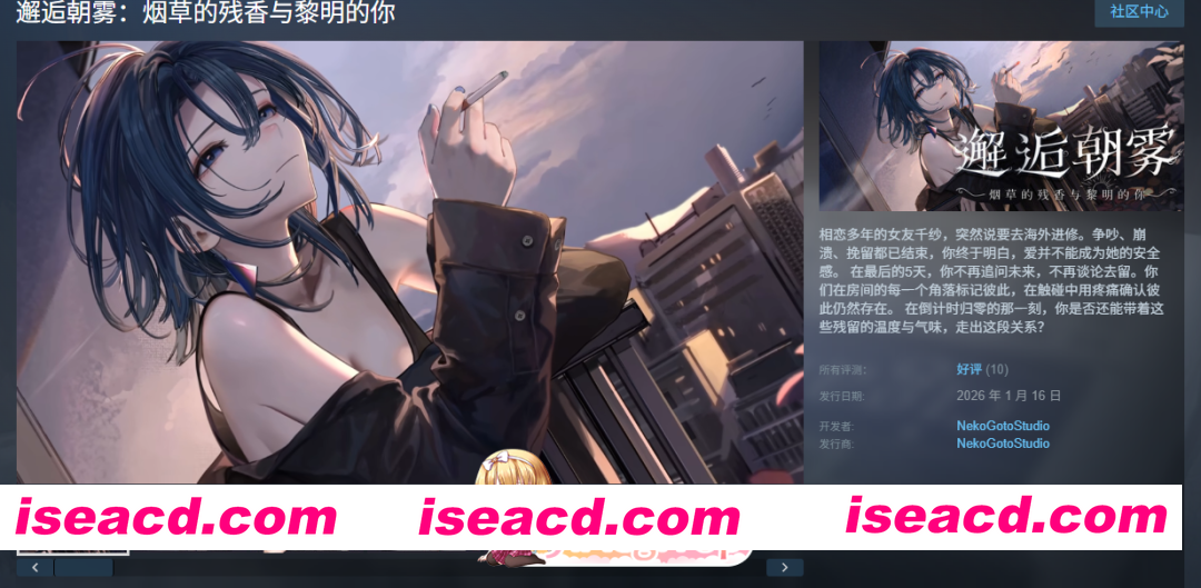 邂逅朝雾:烟草的残香与黎明的你 STEAM官方中文版 游戏简介: 你和千纱相恋多年,她是才华横溢的画家,画作如她本人一般的引人注目却又透露着疏离。 相恋多年,你好像始终走不进千纱的内心。 这一天,千纱毫无预兆地告诉你,她要去海外进修。 在最后的5...