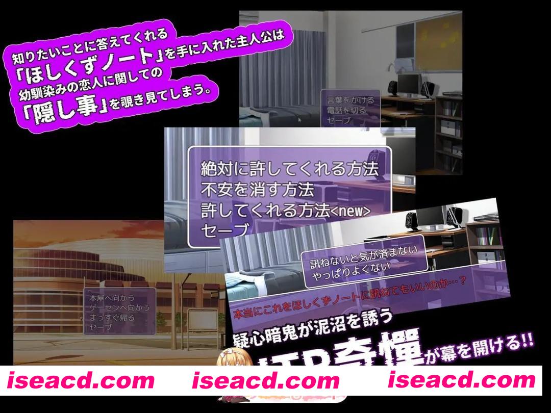 游戏概述: 疑神暗鬼诱人深陷泥潭 NTR奇谭就此拉开帷幕!! 获得了一本能解答任何问题的「星屑笔记」后,主人公窥视到了青梅竹马恋人所隐藏的秘密。 〇窥视的内容将导致事态朝着意想不到的坏方向发展!? 有时,以善意做出的选择反而会招致最糟糕的结果​───────。 〇在「交流模式」中,可以享受与女主角们"片刻的日常"。 共收录15话。 丰富的立绘与表情差分所描绘的浓烈NTR剧情,敬请享受!! ※ 约收录30种CG。 ※ 体验版仅可游玩固定的路线。 请在理解此设定的基础上,将其用作运行确认。 ※ 产品版中搭载有回想功能。 ※ 搭载有全回想解锁功能。