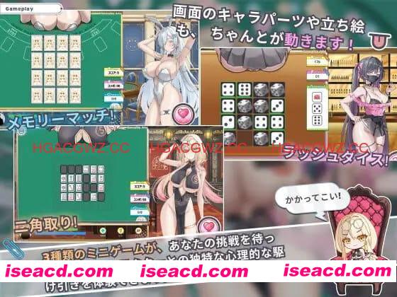 游戏内容:在本作中,玩家将扮演“赌博之圣”,在海上赌场“巨金城”与美女们不断对决,同时逐步逼近在暗中活跃的地下组织“凯撒集团”的真面目。通过赢得迷你游戏来推进剧情,随着故事发展,与她们的关系将不再仅仅停留于“赌局”,而会向更深处发展。通过在对决中步步紧逼这些冷酷的干部,她们将逐渐被动摇于主人公“作为男人的魅力”,最终身心皆被其支配。本作描绘的正是这一过程。