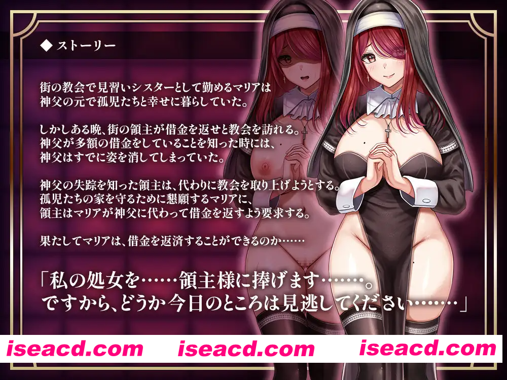 社团名 砂時計と鉛筆 发售日 2026年01月03日 0时 年龄指定 R18 作品形式 模拟/有音乐 分类 换装 ,修女, 沉迷,快乐,堕落 ,卖春,援交, 教育 ,巨乳,爆乳 ,丰满 色情场景 ◆ 修女为了赚钱,要向镇上的男人们卖淫。 根据卖淫的地点和当时的时间,会触发不同的色情场景。 由于修女尊崇禁欲,所以对性存在抵触心理。 她的服务很笨拙,在性行为中也会表现出厌恶,希望能快点结束。 但是,随着卖淫次数的增加,修女逐渐觉醒了快感。 ※场景示例 ・被灌醉后被带回住处 ・卖淫时被卫兵发现,通过色诱让对方保密 ・对要求用脚服务的请求感到困惑 等等…… 随着故事的推进,会出现愿意支付高额报酬来调教修女的人。 前往他那里,就可以体验调教模式。 在调教模式中,可以通过点击这种直观的操作来调教修女。 您可以欣赏到修女通过 Spine 动画做出的反应。 ※操作以鼠标为前提。 角色 玛利亚修女(可改名) 在镇上的教会工作的见习修女。由于过去是孤儿,所以对孩子们很温柔。 为了教会里生活的孤儿们,她要偿还神父留下的债务。 一开始她带着厌恶感从事卖淫活动,但在反复的过程中,她逐渐体会到了被禁止的快乐……。 因为宗教戒律禁止,她对性方面的知识一无所知。 ◆ 在色情场景中也能体现的换装功能 ◆ 通过换装功能,可以将修女打扮成自己喜欢的样子! 当然,在色情场景中也会有所体现。 发色、肤色等,组合方式超过 5 万种! ◆ 六种结局 ◆ 根据玩家的选择,修女的结局会发生变化。 究竟,等待修女的命运会是怎样的呢……。