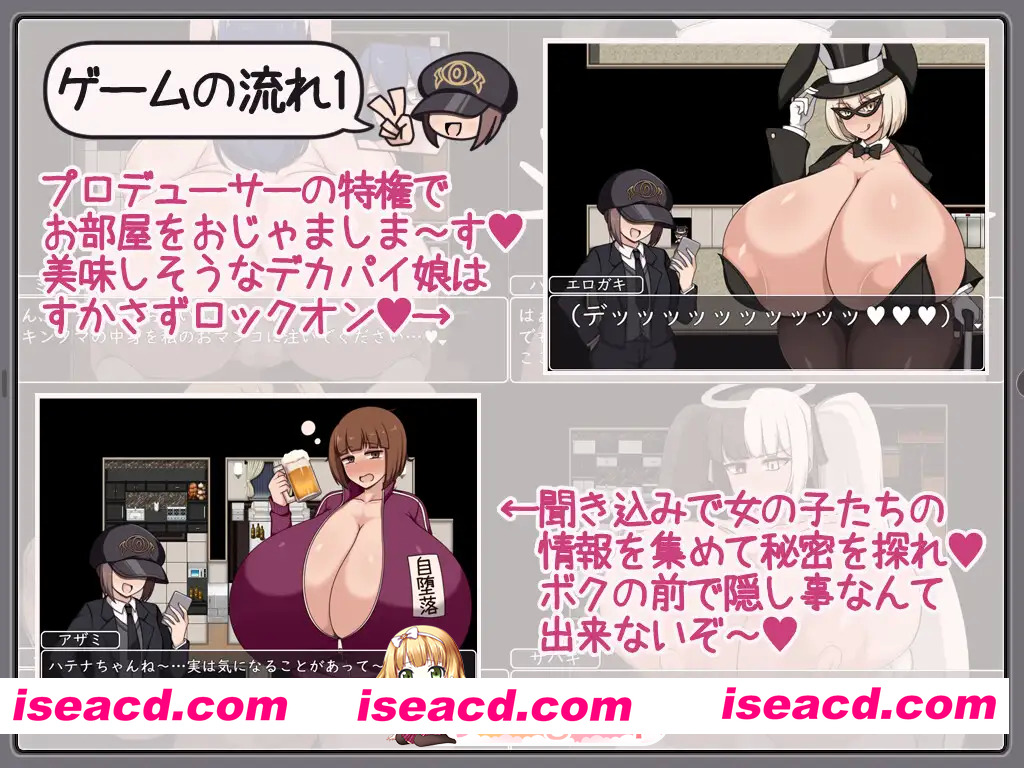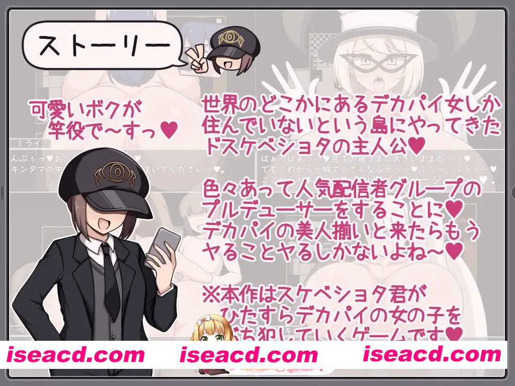 ■成人场景 主要角色共9人 ※所有角色均有乳交&体内射精场景! ・从背后为巨乳经理播种 ・暴躁系主播的M字开腿挑逗舞蹈 ・魔术师主播的色情魔术秀 ・小恶魔系主播的反向骑乘 ・阴角主播的舔蛋手淫 ・强迫排行榜第一主播进行舔肛乳交 等等… ※游戏中没有残酷场景或女孩哭泣等内容,整体风格较为明快。