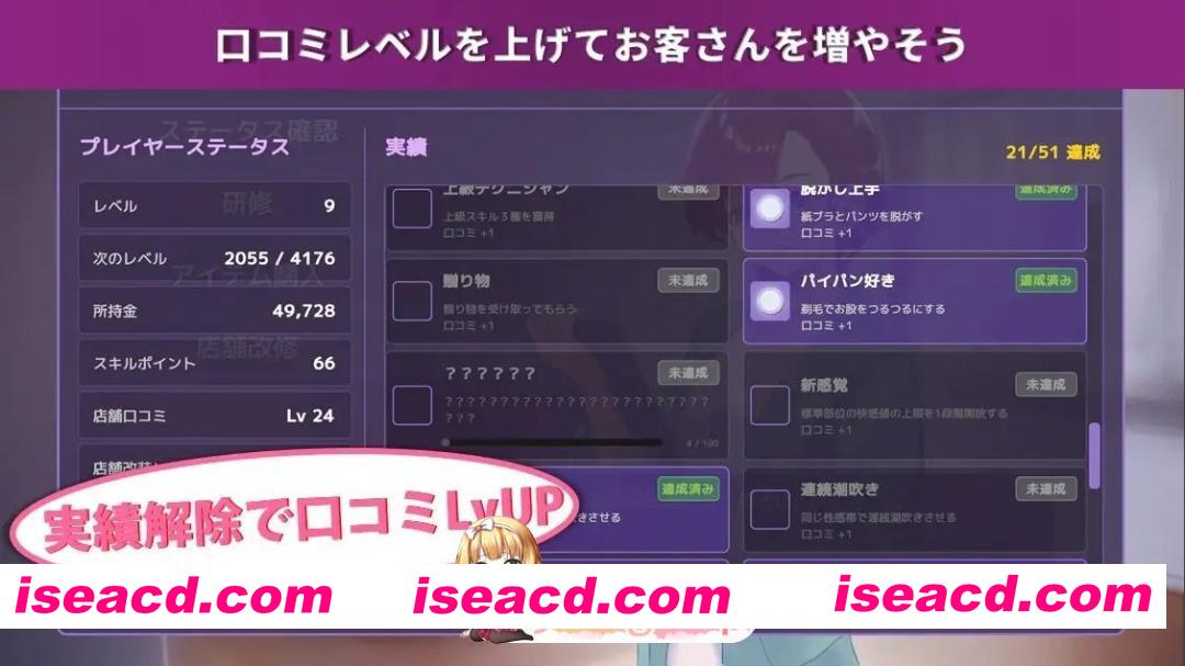 游戏概述: 你作为按摩店“Relax”的店长,任务是让顾客满意、逐步提升口碑评价等级。随着等级提高,你将解锁各种按摩技法、沟通技巧以及道具。 按摩场景采用完整的Live2D模型,能够响应点击和拖拽操作并呈现相应动画。根据状态变化,可使用的按摩手法和顾客的反应也会有所不同。请灵活运用技巧,尽情享受顾客的各种失态表现吧。 游戏内还附带了已解锁玩家技能等的存档数据。(可跳过约4小时的游戏流程)。
