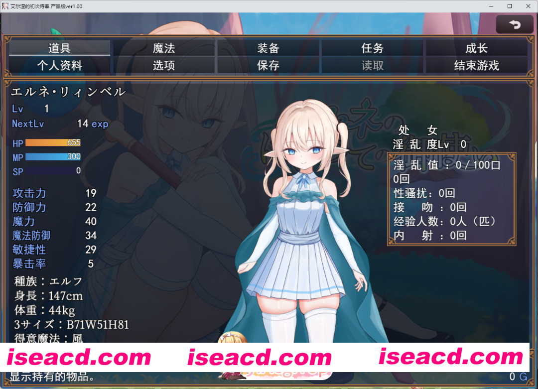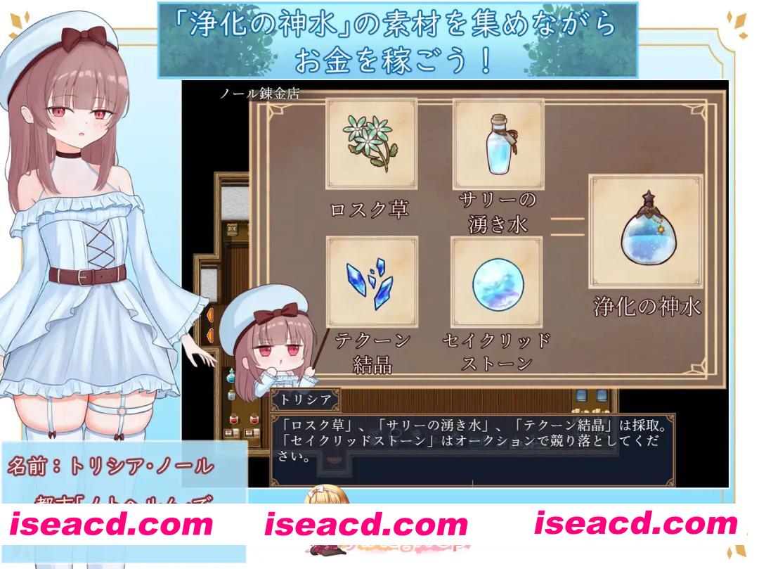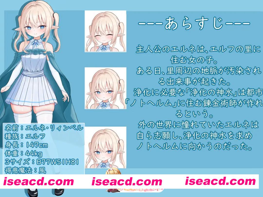 游戏介绍· 剧情梗概 主人公艾尔涅是住在“精灵之树”管理的精灵村落里的魔法使少女。某天突然,村落周边发生了地脉被污染、魔力枯竭的事件。能制作出清除地脉污染所需的“净化神水”的,是住在都市“诺托赫尔姆”的炼金术士。向往着外面世界的艾尔涅主动请缨,为寻求“净化神水”而离开了精灵村落。 主人公与次要角色 名字:艾尔涅·琳贝尔 住在“维尔大森林”精灵村落的女孩。她富有魔法才能,每天进行着魔法修炼。对村落里一成不变的生活感到有些厌倦。 名字:特莉希娅·诺尔 在“诺托赫尔姆”经营炼金店的少女。是诺尔炼金店的孙女,性格沉稳。兴趣是制作各种道具。通过炼金术为艾尔涅提供支持。 收集“净化神水”的材料吧! “净化神水”的材料既有通过采集获得的,也有仅在拍卖会上出售的!一边在各地收集采集材料,一边赚取用于在拍卖会上成功竞标所需的资金50万G吧! 包含换装要素! 立绘、战斗画面、性骚扰Cut-in、部分CG对应服装差分!穿上喜欢的服装去冒险吧! 但是,太过暴露的服装如果不提升淫乱度是无法装备的! 艾尔涅的冒险开始了! 诺托赫尔姆拥有从工会到娼馆的各类设施。是正经地接受工会委托,还是在娑馆出卖春色,全凭玩家决定! 身为美丽而稀有的存在,艾尔涅逐渐迷惑了诺托赫尔姆的居民们…… 在村落里终日埋头于魔法修炼的艾尔涅,对他人的恶意并不了解…… 受到敌人攻击导致伤害时,服装会破损!防御力也会下降,所以用魔法来修复吧!在BOSS战中HP变为0的话……。